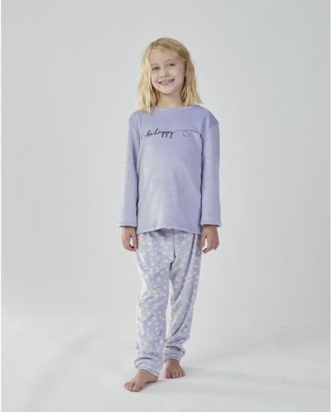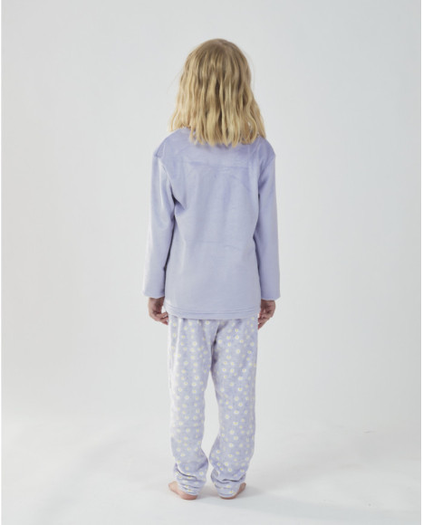 Pijama de niña compuesto por una camiseta de manga larga en tono lavanda con detalle bordado en la parte frontal y un pantalón largo a juego con estampado de margaritas en blanco y amarillo. El tejido es suave y cómodo, pensado para ofrecer calidez durante las noches más frescas. Su diseño alegre y desenfadado lo convierte en una prenda ideal para combinar confort y estilo en el descanso diario.