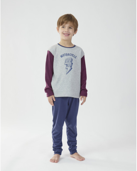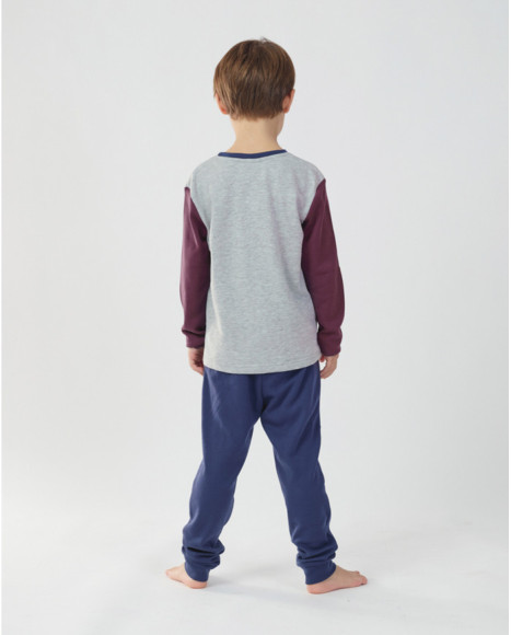 Pijama largo para niño con camiseta gris y morado y pantalón azul