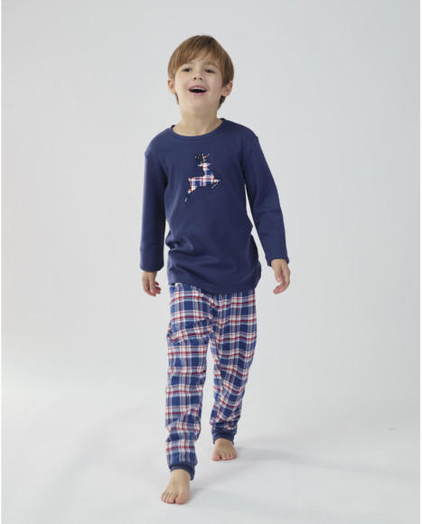 Pijama de niño confeccionado en tejido cálido y confortable, compuesto por una camiseta de manga larga en color azul con estampado frontal de un reno a cuadros, junto con un pantalón largo en estampado de cuadros en tonos azules, rojos y blancos. Su diseño divertido y moderno aporta un aire juvenil, mientras que la suavidad del tejido asegura abrigo y comodidad durante las noches frías. Una prenda perfecta para descansar con estilo y confort en casa.