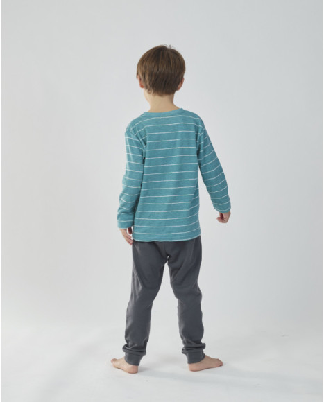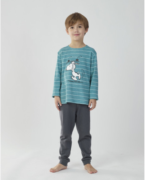 Pijama infantil confeccionado en tejido suave y cómodo, ideal para el descanso diario. Incluye una camiseta de manga larga en color verde con finas rayas horizontales y un divertido estampado frontal de Snoopy, que aporta un aire alegre y simpático. El conjunto se completa con un pantalón largo en color gris oscuro, de corte recto y confortable. Perfecto para acompañar a los más pequeños en sus noches con comodidad y un estilo divertido.