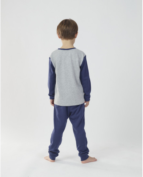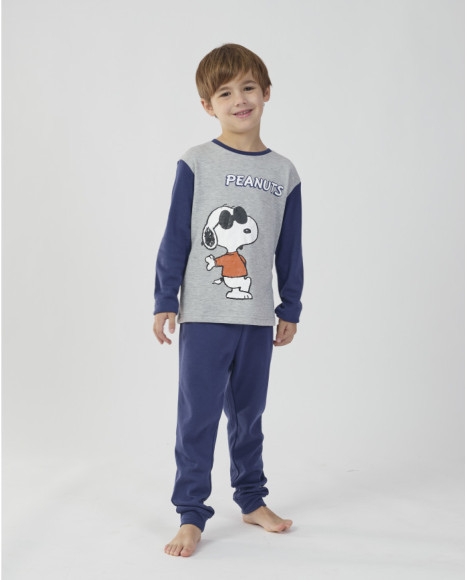 Pijama de niño confeccionado en tejido suave y agradable al tacto, ideal para garantizar comodidad durante el descanso. La camiseta de manga larga combina color gris en el frente con mangas y detalles en azul, luciendo un divertido estampado de Snoopy con gafas de sol y la palabra "Peanuts" en la parte superior. El pantalón largo, en color azul liso, completa el conjunto con un diseño cómodo y práctico. Perfecto para acompañar las noches de los más pequeños con estilo y diversión.