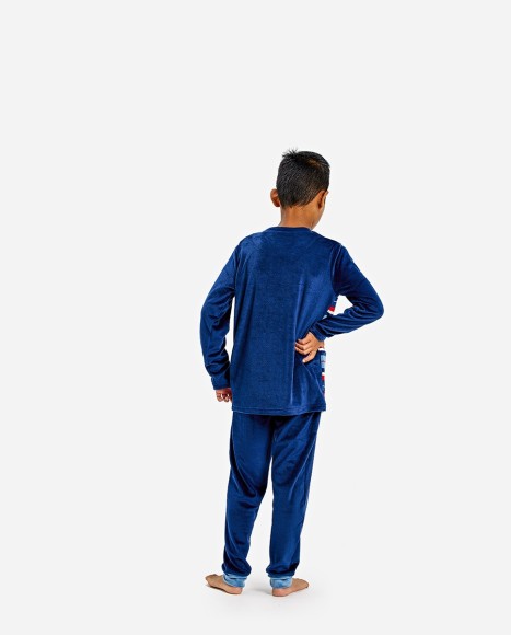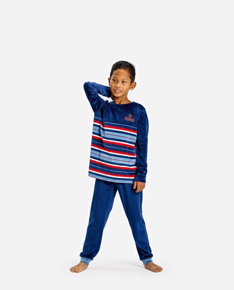 Pijama compuesto de camiseta manga larga color marino y rayas, con cuello redondo y pantalón largo en color marino. Pijama confeccionado con terciopelo de gran suavidad y muy confortable por su calidez y tacto.