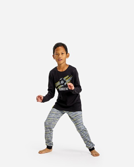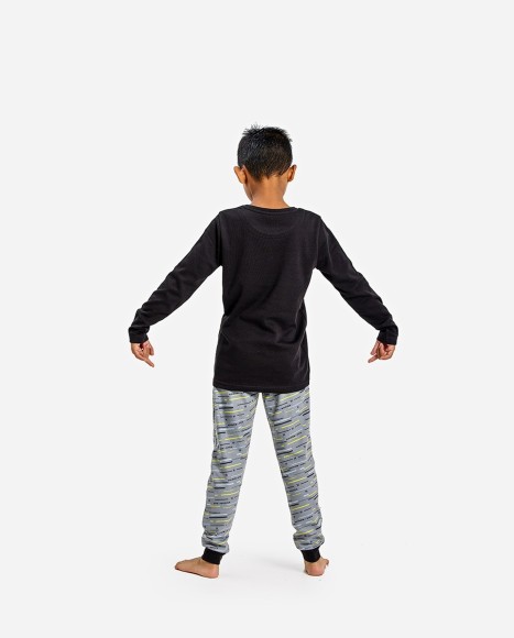 Pijama compuesto de camiseta manga larga de color negro, cuello redondo y pantalón largo estampado en color gris. Pijama confeccionado con tejido de gran suavidad y muy confortable por su calidez y tacto.