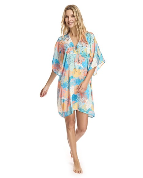 Kaftan Ory con estampado de hojas en tonos pastel. Composición: 100% Poliéster Instrucciones de lavado: Lavar a mano / No usar secadora / No planchar / No usar lejía / No lavar en seco / No escurrir